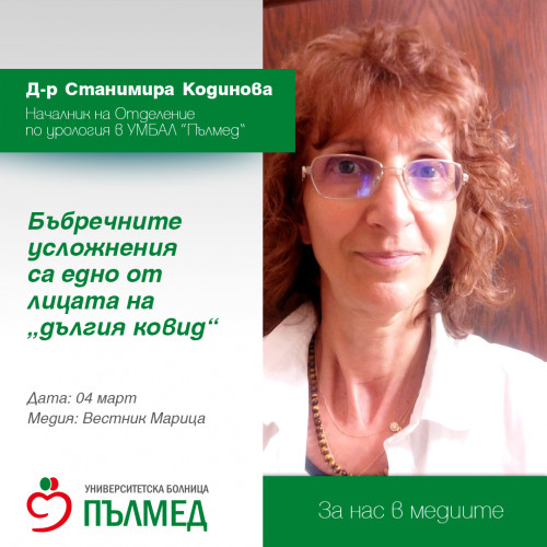-Като говорим за профилактиката на постковидните усложнения имаме предвид медицина, уповаваща се на доказателства. Вирусът на Ковид-19 засяга респираторната система, засяга кръвта, храносмилателния тракт и уринарната система и в резултат може да се намери в урината, фекалиите и кръвта. Бъбречните усложнения зависят от тежестта на прекарания Ковид-19. Времето на поява е различно. Те са едно от важните лица на многоликия така наречен „дълъг ковид“. Задължително трябва да се направи контролен преглед, защото може да има промени в бъбреците, но това да е без симптоми. Трябва да се направи ехография и лабораторни изследвания. Изследванията се налагат и поради факта, че бъбречните заболявания са познати като „тихите убийци”. Знае се, че вирусът атакува клетките чрез ангиотензин конвертиращия ензим (АСЕ 2), а АСЕ 2 рецепторите са високо експресирани в бъбрека, по-точно в тубуларния епител. Ако грижата за бъбреците не е интегрирана част от постковидната стратегия, то ние ще загубим възможност да помогнем на стотици хора, които нямат идея, че функцията на бъбреците им е намаляла заради вируса.