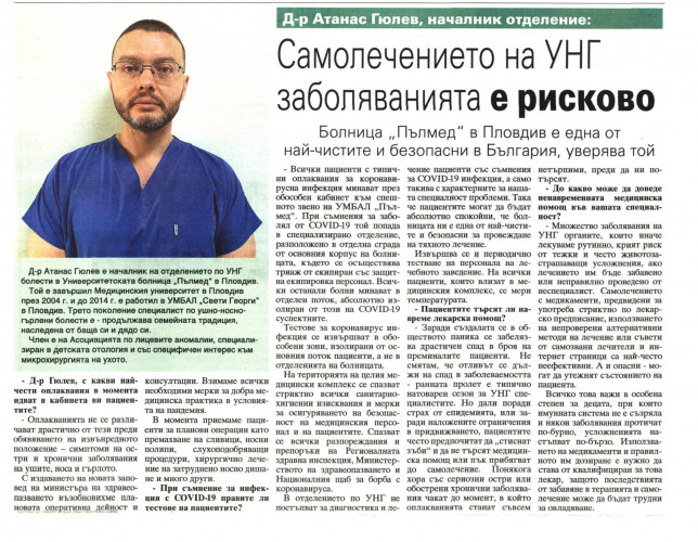 Д-р Атанас Гюлев, началник отделение: Самолечението на УНГ заболяванията е рисково