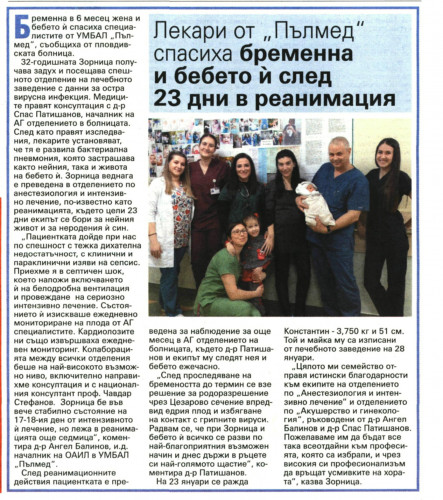Лекари от "Пълмед" спасиха бременна и бебето й след 23 дни в реанимация