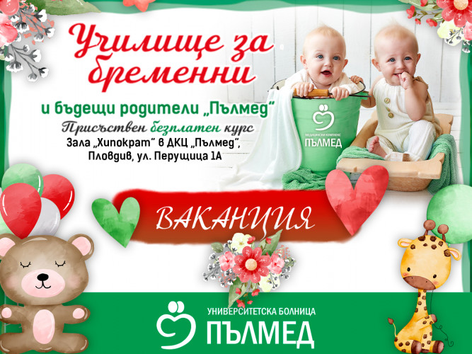 Училището за бременни и бъдещи родители на УМБАЛ „Пълмед“, което от март провеждаше безплатен присъствен курс, излиза във ваканция от юни до 19 септември, когато ще се проведе първата лекция от новата учебна година.