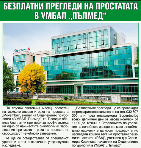 По случай световния месец, посветен на мъжкото здраве и рака на простатата „Movember“, екипът на Отделението по урология в УМБАЛ „Пълмед“, гр. Пловдив обявява безплатни прегледи за профилактика на едно от най-честите онкологични заболявания при мъжа – рака на простатата, съобщиха от лечебното заведение.