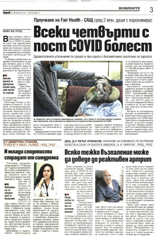 ДОЦ. Д-Р ПЕТЪР АТАНАСОВ, НАЧАЛНИК НА КЛИНИКАТА ПО ВЪТРЕШНИ БОЛЕСТИ И CОVID-19 СЕКТОР В УМБАЛСМ "Н. И. ПИРОГОВ", ПРЕД "ТРУД": Всяко тежко възпаление може да доведе до реактивен артрит