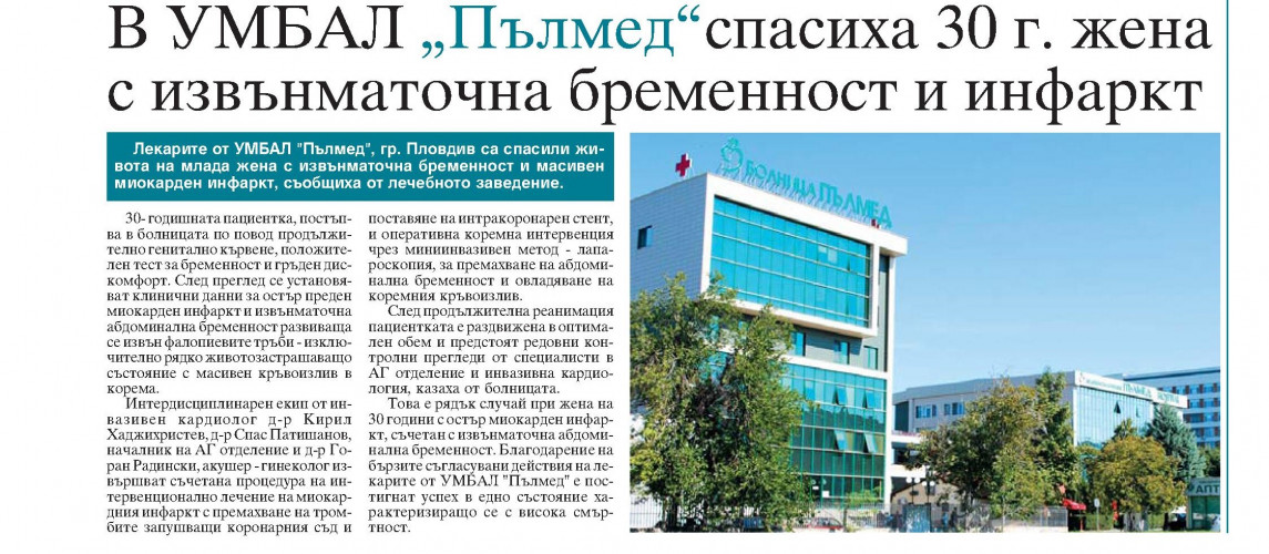 Това е рядък случай при жена на 30 години с остър миокарден инфаркт, съчетан с извънматочна абдоминална бременност. Благодарение на бързите съгласувани действия на лекарите от УМБАЛ „Пълмед“ е постигнат успех в едно състояние характеризиращо се с висока смъртност.