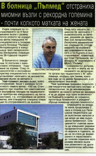 В болница “Пълмед” отстраниха миомни възли с рекордна големина