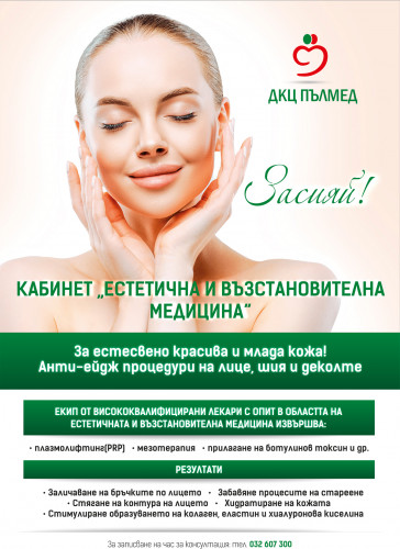 В ДКЦ „Пълмед“ вече работи кабинет по естетична и възстановителна медицина, който предоставя богата палитра от анти-ейдж процедури на лице, шия и деколте. Консултациите и процедурите, сред които плазмолифтинг (PRP), мезотерапия, прилагане на ботулинов токсин и др. се извършват от висококвалифицирани специалисти.