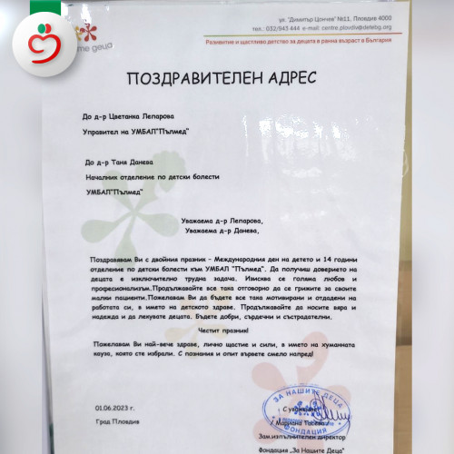 „Да получиш доверието на децата е изключително трудна задача. Изисква се голяма любов и професионализъм. Продължавайте все така отговорно да се грижите за своите малки пациенти. Пожелавам ви най-вече здраве, лично щастие и сили, в името на хуманната кауза, която сте избрали. С познания и опит вървете смело напред”, гласи поздравителният адрес към управителя на УМБАЛ „Пълмед” д-р Цветанка Лепарова и към началника на Отделението по детски болести д-р Таня Данева, поднесен от Фондация “За Нашите Деца”, заедно с красив букет от рози.