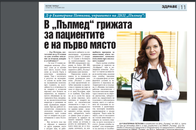 За тези 15 години медицински комплекс „Пълмед“ успя да се наложи като място, където човек може да получи бърза и качествена медицинска грижа. Това е постигнато в резултат на неуморните усилия на целия екип на медицинския комплекс през годините, на всеотдайността и отзивчивостта на лекарите и останалия персонал към болката на пациентите, на непрекъснатото обновяване на материалната база, внедряване на високотехнологична апаратура и развиване на нови медицински направления. При нас работят изключителни специалисти, спечелили доверието на пациентите, като голяма част от лекарите ни са разпознаваеми в цяла България. Все по-често към нас се обръщат и пациенти от други държави, което е сигурен знак, че работим в правилната посока и стриктно спазваме добрата медицинска практика. Освен за здравето на пациентите ни, ние се стараем да осигуряваме комфорт и на техните близки, защото знаем, че и това е много важно като част от комплексната грижа за болния. Смея да кажа, че към днешна дата, медицински комплекс „Пълмед“ прилага всички съвременни стандарти за диагностика и лечение на най-разнообразни патологии. Ние държим изключително много на мултидисциплинарния подход и всички работим заедно в името на нашите пациенти.