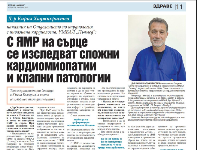 Провеждането на ядрено-магнитен резонанс (ЯМР) на сърце в УМБАЛ „Пълмед“ е възможно благодарение на отличната колаборация между болниците от групата на „Булфарма“, с дейната помощ на колегите от УМБАЛ „Софиямед“ в лицето на д-р Радослав Петков и д-р Георги Стоилов от УМБАЛ „Пълмед“. Нашата цел е да предоставяме най-добрите и най-съвременните методи за изследване на сърдечносъдовата система.