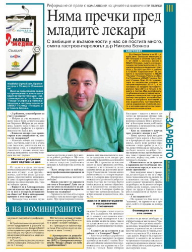 Гастроентерологът от МБАЛ "Пълмед" д-р Никола Боянов е номиниран в кампанията на в.Стандарт "Млад медик на годината".