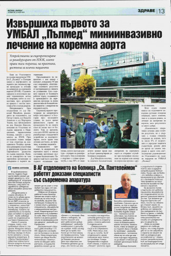Екип на Отделението по съдова хирургия на УМБАЛ „Пълмед“ в Пловдив записа в портфолиото си първите две ендоваскуларни процедури за лечение на аневризма на коремната аортата (EVAR). Съдовите хирурзи са използвали щадящ терапевтичен метод на операция, който се осъществява през артериите на краката с местна анестезия и без големи разрези.