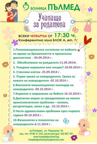 Най-модерното частно здравно заведение в Пловдив МБАЛ „Пълмед“ стартира на 4-ти септември безплатно Училище за родители. Бъдещите майки ще могат да се запознаят с всички по-важни аспекти от бременността, раждането и появата на новороденото от специалистите на лечебното заведение всеки четвъртък от 17:30ч. в Конферентната зала на ет.7 в Блок А на МБАЛ „Пълмед“. Преди началото на всяка лекция от 13:00 до 17:00ч. бременните дами ще могат да посетят Отворените врати, които лечебното заведение организира в отделението по акушерство и гинекология, и неонатология като разгледат условията в него и се запознаят с различните специалисти.