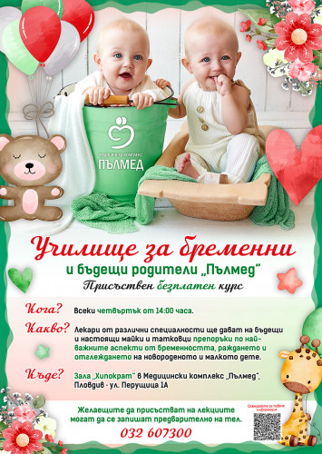 Училището за бременни и бъдещи родители на УМБАЛ „Пълмед“ възобновява своя присъствен безплатен курс от лекции на 7 март. Всеки четвъртък от 14:00 часа различни лектори от медицинския комплекс ще дават на бъдещи и настоящи майки и татковци съвети и препоръки в областта на акушер-гинекологията, неонатологията, педиатрията, анестезиологията за най-важните аспекти от бременността, раждането и отглеждането на новороденото и малкото дете.