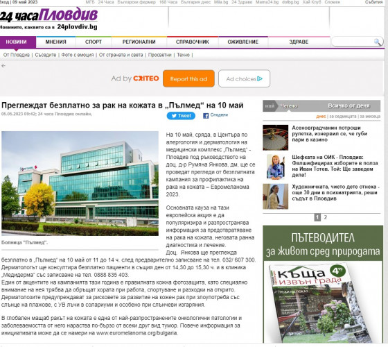На 10 май, сряда, в Центъра по алергология и дерматология в медицински комплекс „Пълмед“ - Пловдив под ръководството на доц. д-р Румяна Янкова, дм, ще се проведат прегледи от безплатната кампания за профилактика на рака на кожата – Евромеланома 2023.