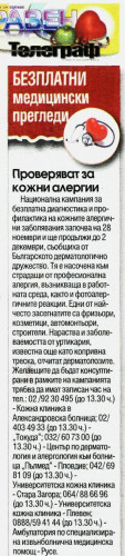 - Кожна клиника в Александровска болница; 02/ 403 49 33 (до 13.30 ч.) - "Токуда"; 032/60 73 00 (до 13.30 ч.) - Център по дерматология и алергология към болница "Пълмед" - Пловдив; 042/69 81 09 (до 13.30 ч.)-Университетска кожна клиника - Стара Загора; 064/ 88 66 96 (до 13.30 ч.) - Университетска кожна клиника - Плевен; 0888/5941 44 (до 13.30 ч.)-Амбулатория по специализирана извънболнична медицинска помощ - Русе.