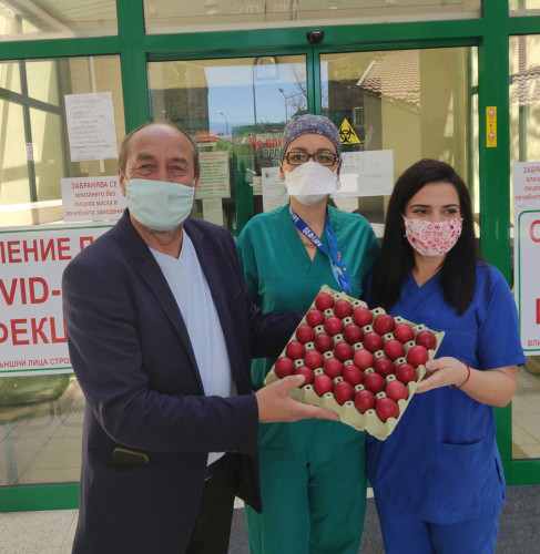Те подариха на екипа лекари, медицински сестри и служители на УМБАЛ "Пълмед" боядисани в червено великденски яйца и им пожелаха лично здраве,щастие и увереност в добрия път.