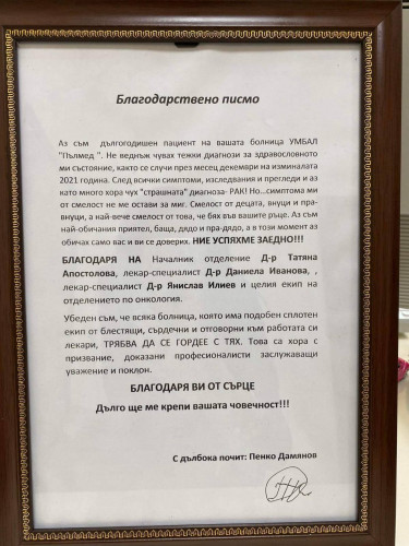 В свое писмо, пациентът Пенко Дамянов изразява сърдечната си признателност към д-р Татяна Апостолова, началник на Отделението по медицинска онкология на УМБАЛ „Пълмед“, към лекарите д-р Даниела Иванова, д-р Янислав Илиев и целия екип на структурата.