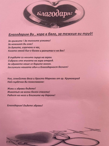 Семейство от Крумовград благодари от сърце на екипа на УМБАЛ „Пълмед“ със стихове