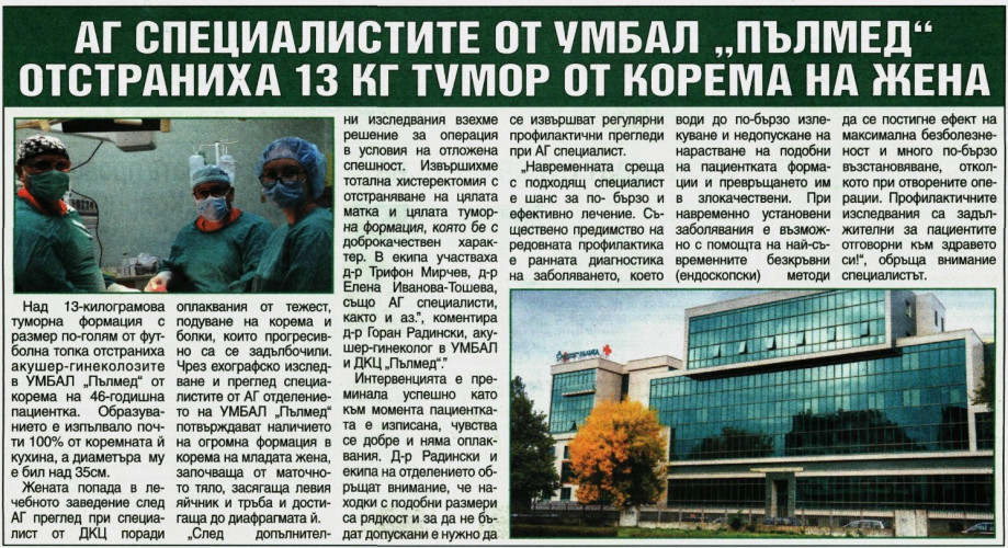Над 13-килограмова туморна формация с размер по-голям от футболна топка отстраниха акушер-гинеколозите в УМБАЛ „Пълмед“ от корема на 46-годишна пациентка. Образуванието е изпълвало почти 100% от коремната й кухина, а диаметъра  му е бил над 35см.